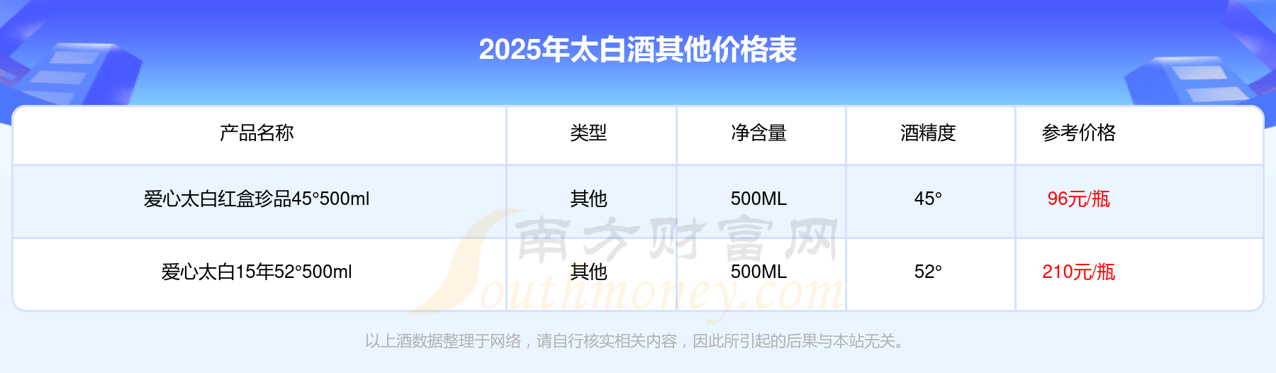 2025年,愛心太白15年52°500ml、愛心太白紅盒珍品45°500ml等太白酒其他酒價(jià)格如下: