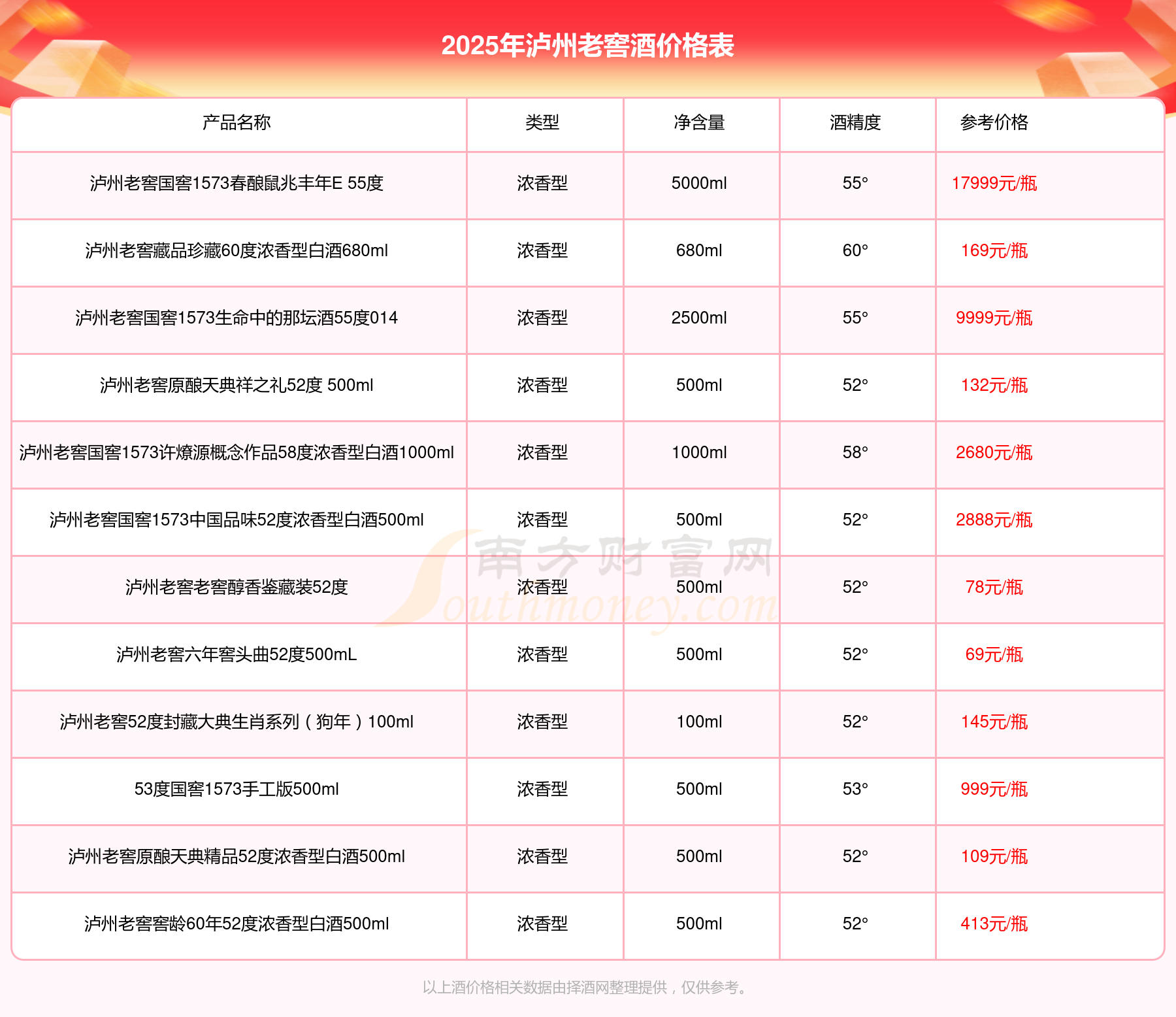 2025年,瀘州老窖國(guó)窖1573春釀鼠兆豐年E 55度、瀘州老窖國(guó)窖1573生命中的那壇酒55度014、瀘州老窖國(guó)窖1573春釀鼠兆豐年A 55度、瀘州老窖國(guó)窖1573生命中的那壇酒55度013濃香型白酒1000ml等瀘州老窖酒價(jià)格如下:瀘州老窖國(guó)窖1573春釀鼠兆豐年E 55度參考價(jià)17999元/瓶、瀘州老窖國(guó)窖1573生命中的那壇酒55度014參考價(jià)9999元/瓶、瀘州老窖國(guó)窖1573春釀鼠兆豐年A 55度參考價(jià)5088元/瓶、瀘州老窖國(guó)窖1573生命中的那壇酒55度013濃香型白酒1000ml參考價(jià)4988元/瓶。