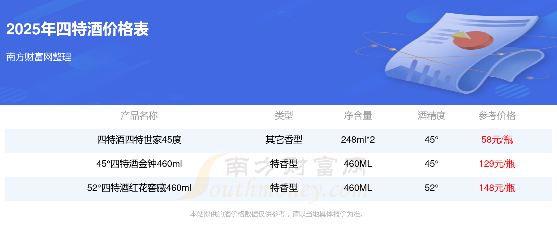 2025四特酒最新價格:52°四特酒紅花窖藏460ml參考價148元/瓶、45°四特酒金鐘460ml參考價129元/瓶、四特酒四特世家45度參考價58元/瓶。
