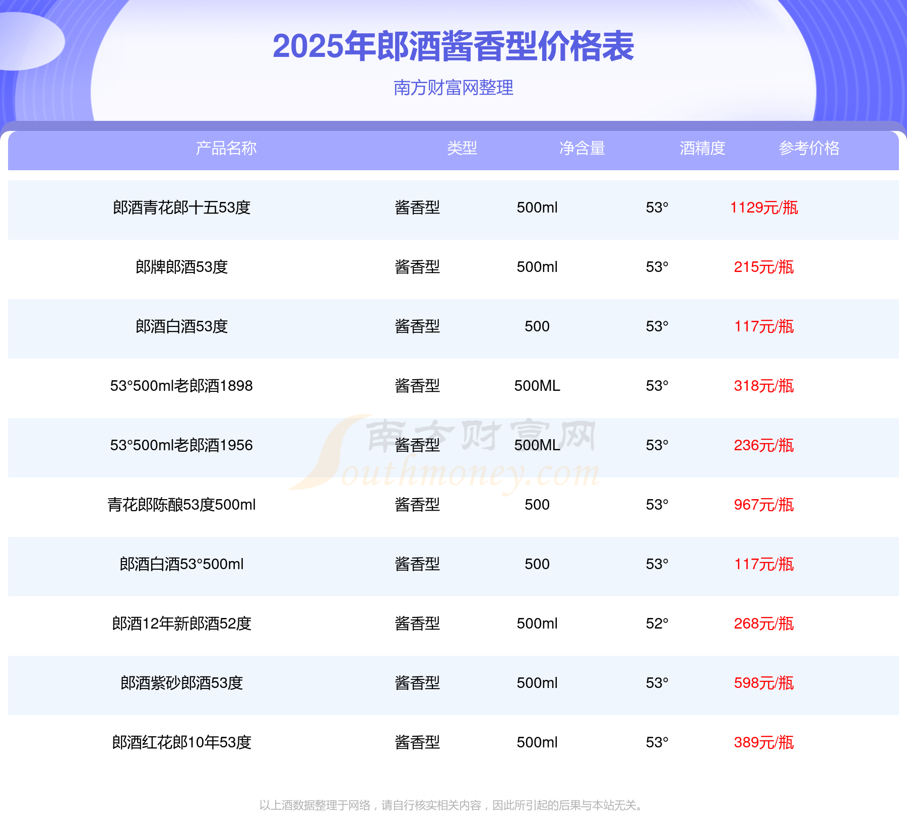 郎酒青花郎十五53度參考價1129元/瓶、青花郎陳釀53度500ml參考價967元/瓶、郎酒紫砂郎酒53度參考價598元/瓶、郎酒紅花郎10年53度參考價389元/瓶、53°500ml老郎酒1898參考價318元/瓶、郎酒12年新郎酒52度參考價268元/瓶。