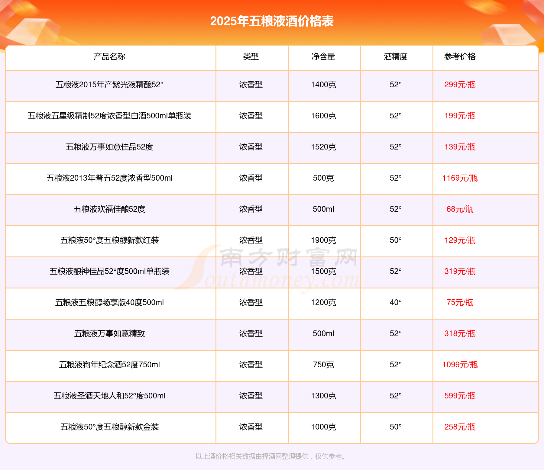 五糧液酒價(jià)格最高的是五糧液百年世博世紀(jì)榮耀紀(jì)念酒60°999ml,參考價(jià)26980元/瓶,最低的是五糧液干一杯小瓶46度,參考價(jià)16元/瓶,價(jià)格高低差為26964元/瓶。