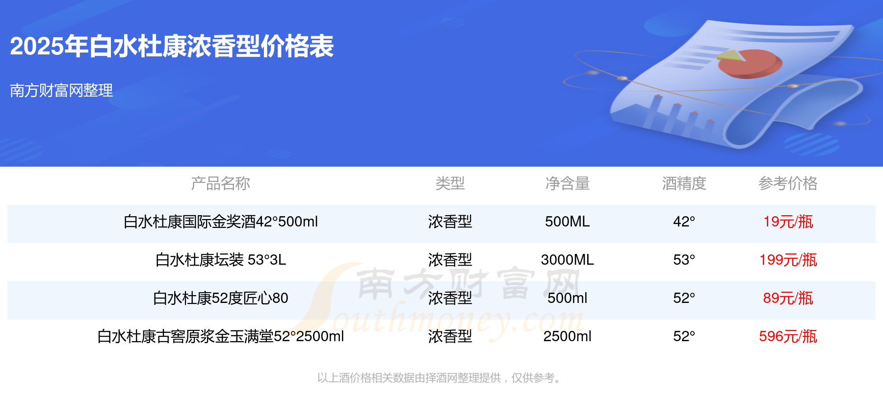 2025白水杜康濃香型酒最新價格:白水杜康古窖原漿金玉滿堂52°2500ml參考價596元/瓶、白水杜康壇裝 53°3L參考價199元/瓶、白水杜康52度匠心80參考價89元/瓶、白水杜康國際金獎酒42°500ml參考價19元/瓶。