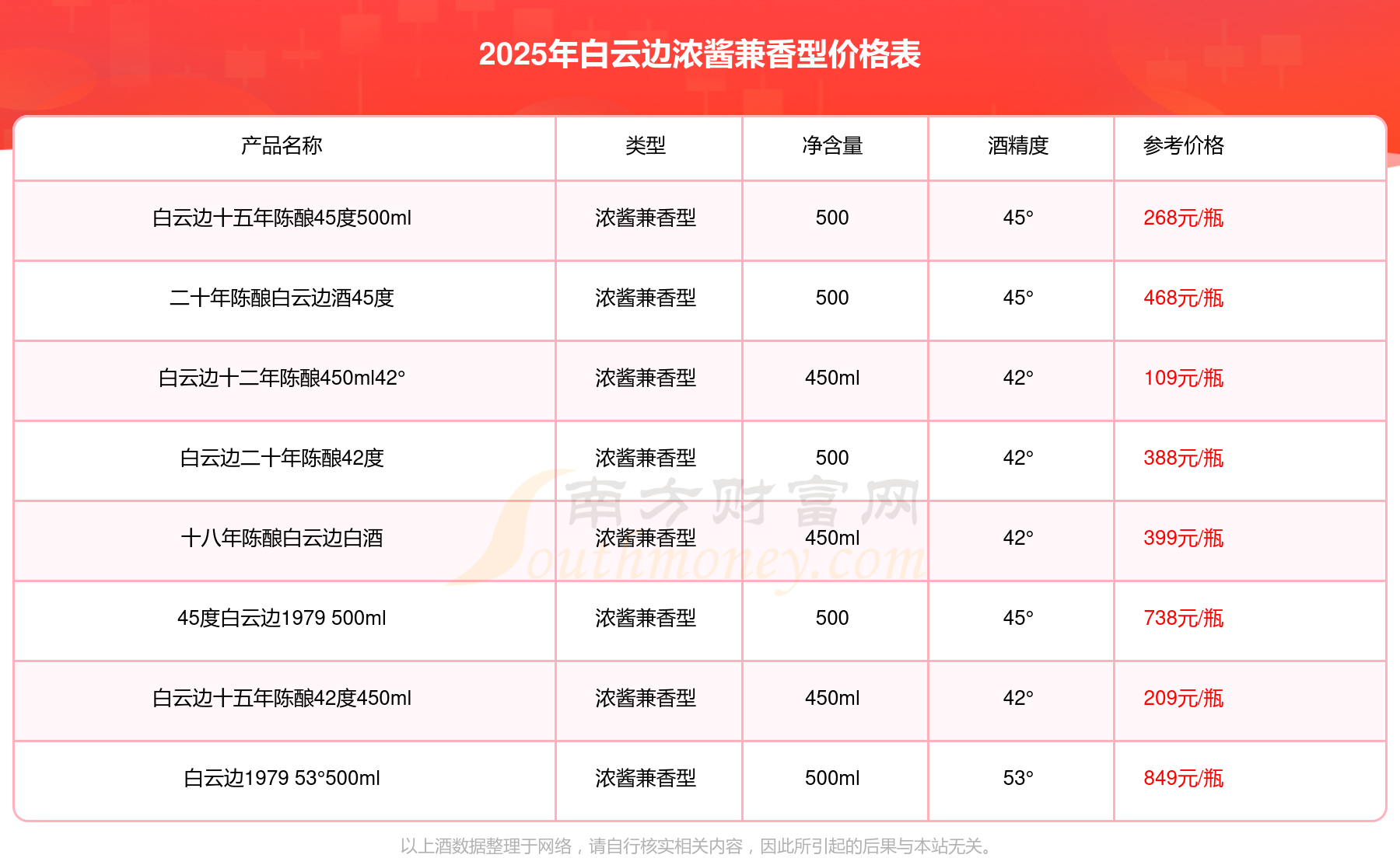 白云邊1979 53°500ml參考價849元/瓶、45度白云邊1979 500ml參考價738元/瓶、二十年陳釀白云邊酒45度參考價468元/瓶、十八年陳釀白云邊白酒參考價399元/瓶、白云邊二十年陳釀42度參考價388元/瓶。