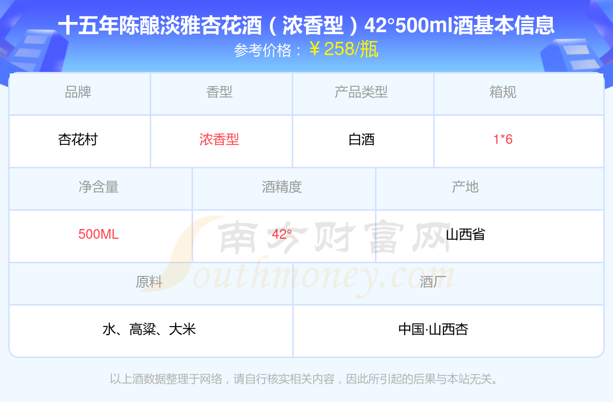 十五年陳釀淡雅杏花酒(濃香型)42°500ml基本信息