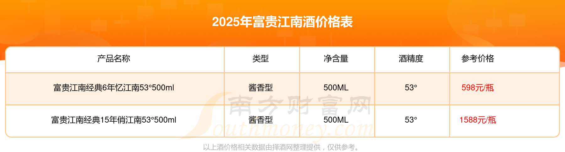 2025年富貴江南價格最高的酒是富貴江南經(jīng)典15年俏江南53°500ml,參考價1588元/瓶,最低的是富貴江南經(jīng)典6年憶江南53°500ml,參考價598元/瓶,價格高低差為990元/瓶。