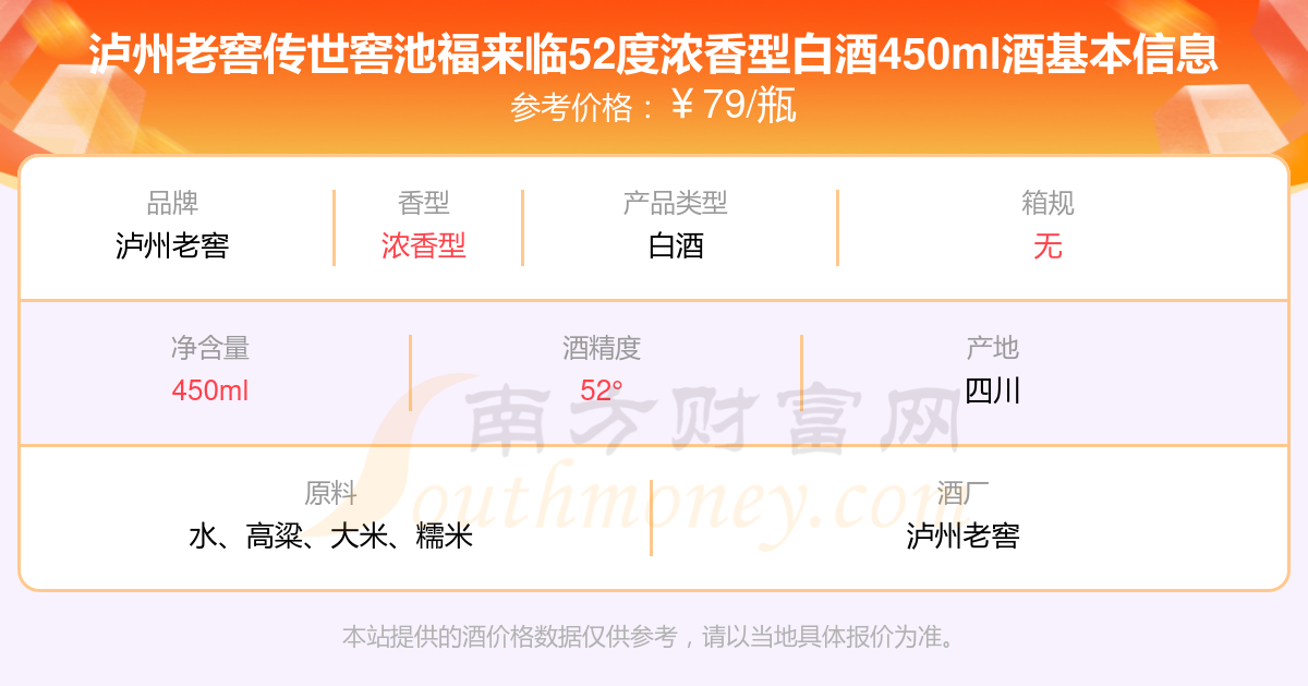 瀘州老窖傳世窖池福來臨52度濃香型白酒450ml基本信息