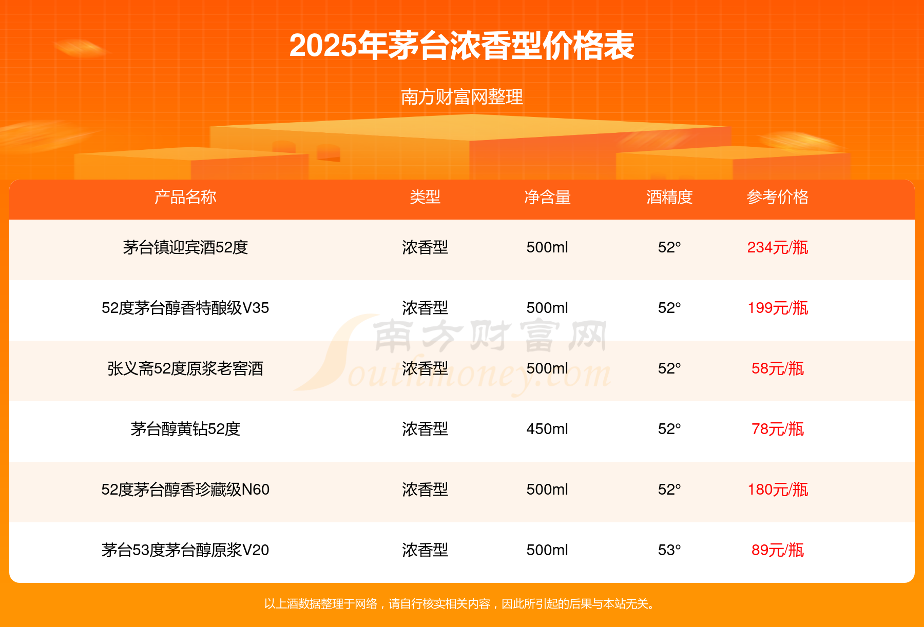 2025年,茅臺(tái)鎮(zhèn)迎賓酒52度、52度茅臺(tái)醇香特釀級(jí)V35、52度茅臺(tái)醇香珍藏級(jí)N60等茅臺(tái)濃香型酒價(jià)格如下:茅臺(tái)鎮(zhèn)迎賓酒52度參考價(jià)234元/瓶、52度茅臺(tái)醇香特釀級(jí)V35參考價(jià)199元/瓶、52度茅臺(tái)醇香珍藏級(jí)N60參考價(jià)180元/瓶。