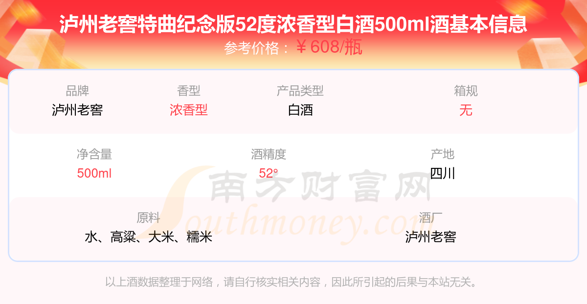 瀘州老窖特曲紀念版52度濃香型白酒500ml基本信息
