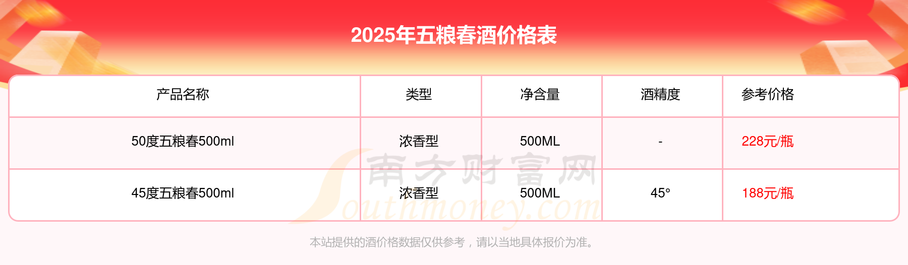 50度五糧春500ml參考價228元/瓶、45度五糧春500ml參考價188元/瓶。