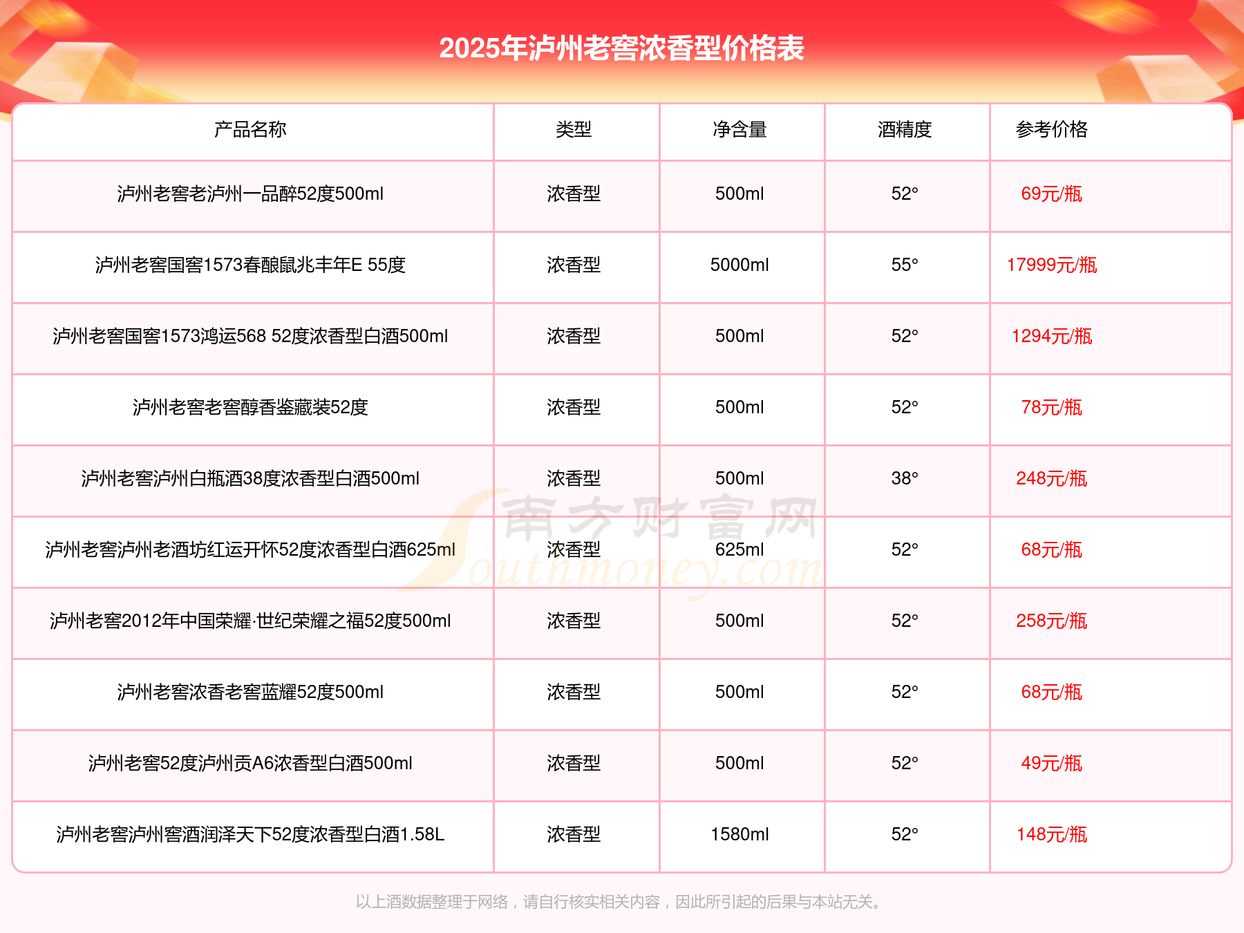 2025年瀘州老窖濃香型酒瀘州老窖國窖1573春釀鼠兆豐年E 55度、瀘州老窖國窖1573生命中的那壇酒55度014、瀘州老窖國窖1573春釀鼠兆豐年A 55度、瀘州老窖國窖1573生命中的那壇酒55度013濃香型白酒1000ml等最新價(jià)格如下: