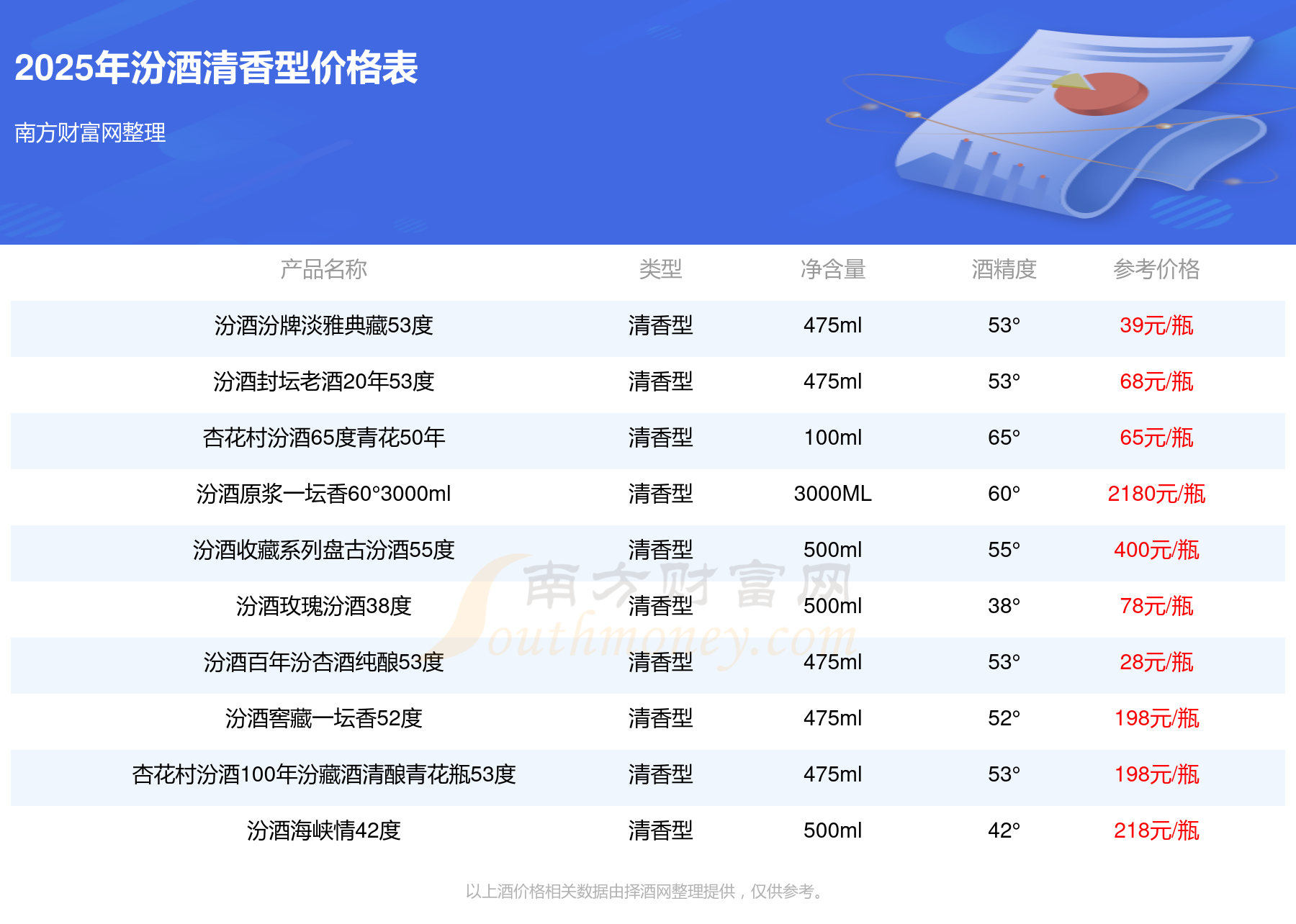 汾酒原漿一壇香60°3000ml參考價2180元/瓶、汾酒原漿一壇香60°1500ml參考價1536元/瓶、42度汾酒青花25參考價598元/瓶。