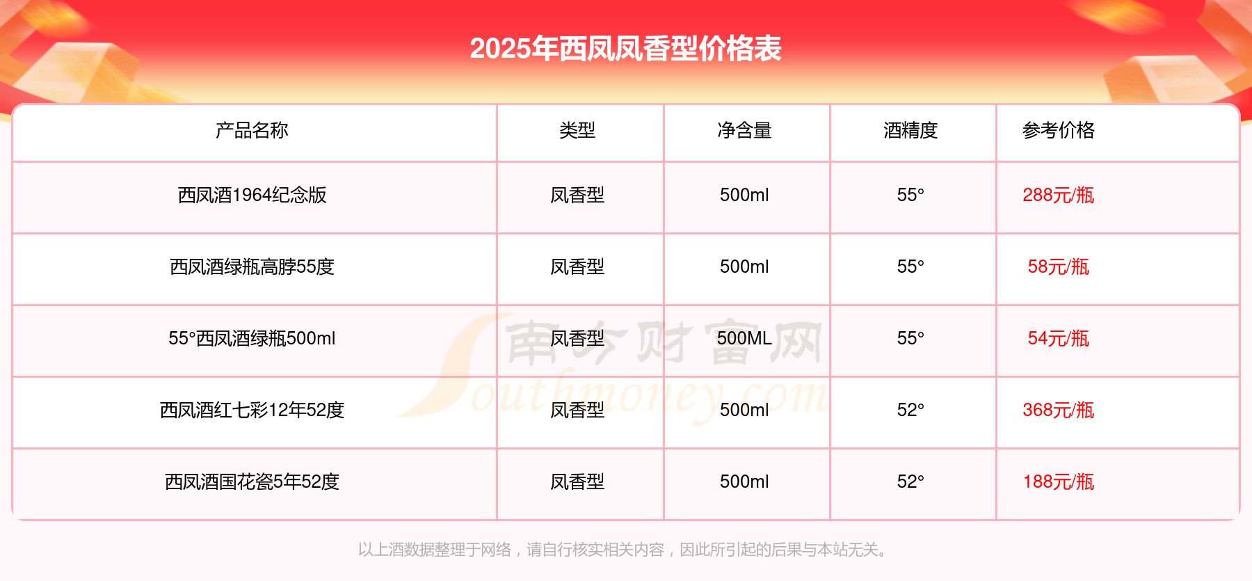 2025西鳳鳳香型酒最新價(jià)格:西鳳酒紅七彩12年52度參考價(jià)368元/瓶、西鳳酒1964紀(jì)念版參考價(jià)288元/瓶、西鳳酒國(guó)花瓷5年52度參考價(jià)188元/瓶、西鳳酒綠瓶高脖55度參考價(jià)58元/瓶。