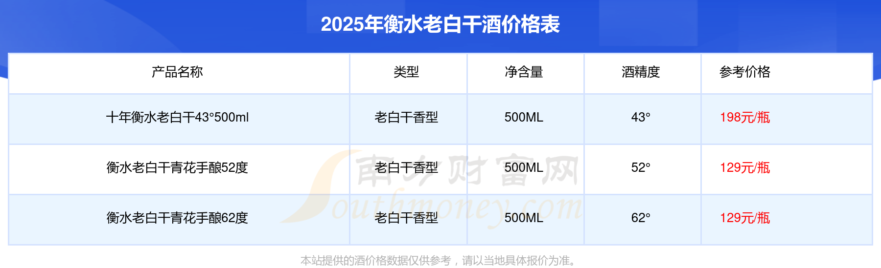 2025年衡水老白干酒十年衡水老白干43°500ml、衡水老白干青花手釀52度、衡水老白干青花手釀62度等最新價(jià)格如下: