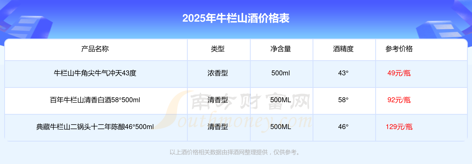 典藏牛欄山二鍋頭十二年陳釀46°500ml參考價(jià)129元/瓶、百年牛欄山清香白酒58°500ml參考價(jià)92元/瓶、牛欄山牛角尖牛氣沖天43度參考價(jià)49元/瓶。