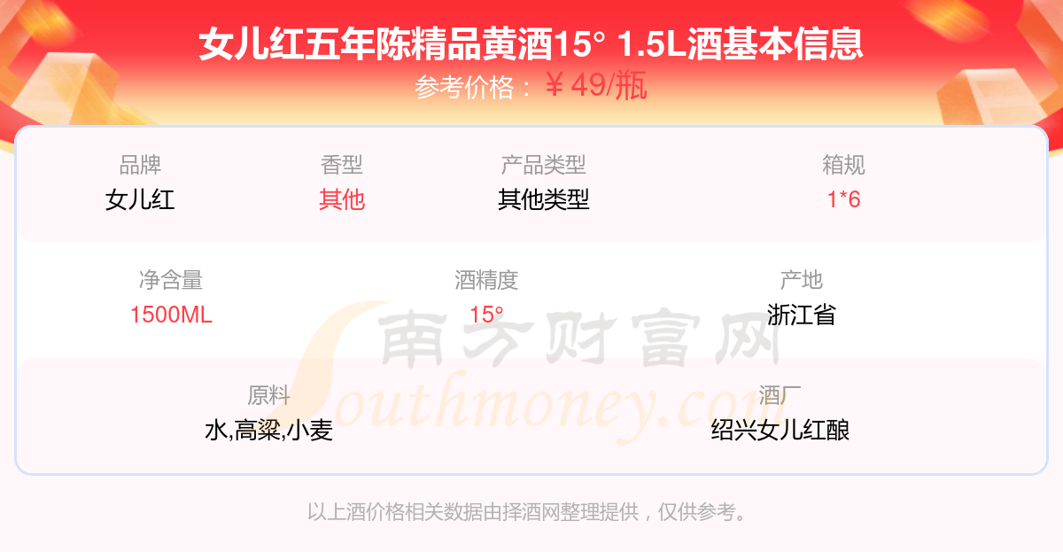 女兒紅五年陳精品黃酒15° 1.5L基本信息