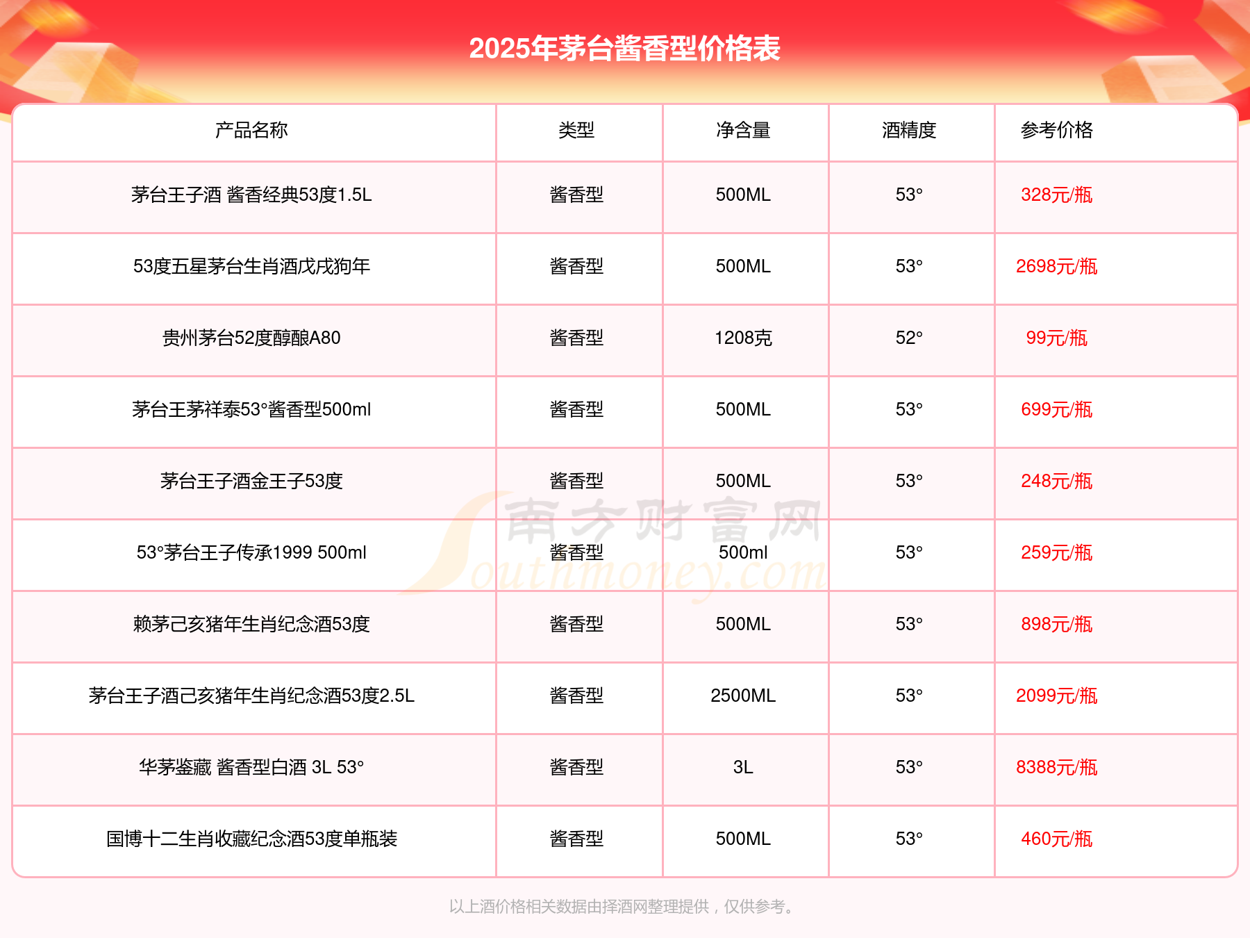 2025年,華茅鑒藏 醬香型白酒 3L 53°、53度五星茅臺生肖酒丁酉雞年、貴州茅臺己亥豬年生肖酒53°500ml、53度五星茅臺生肖酒戊戌狗年等茅臺醬香型酒價格如下: