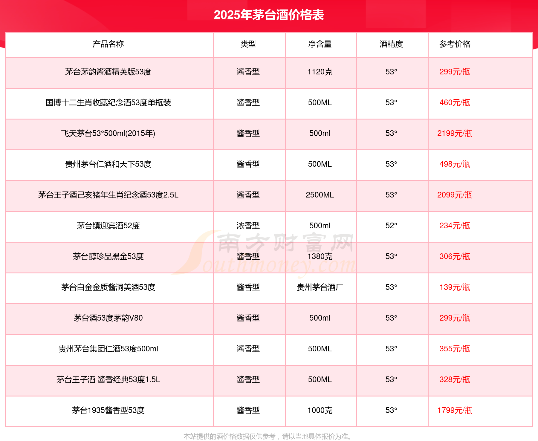 華茅鑒藏 醬香型白酒 3L 53°參考價8388元/瓶、53度五星茅臺生肖酒丁酉雞年參考價2798元/瓶、貴州茅臺己亥豬年生肖酒53°500ml參考價2699元/瓶、53度五星茅臺生肖酒戊戌狗年參考價2698元/瓶、飛天茅臺53°500ml(2015年)參考價2199元/瓶、茅臺王子酒己亥豬年生肖紀念酒53度2.5L參考價2099元/瓶、茅臺1935醬香型53度參考價1799元/瓶、茅臺財富貴賓典藏酒53度參考價1599元/瓶。