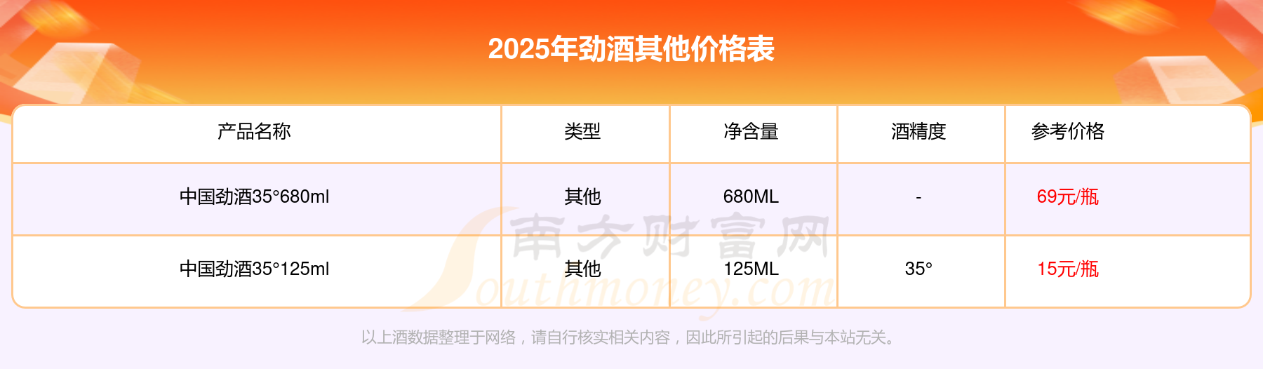2025年勁酒其他酒中國勁酒35°680ml、中國勁酒35°125ml等最新價(jià)格如下:中國勁酒35°680ml參考價(jià)69元/瓶、中國勁酒35°125ml參考價(jià)15元/瓶。
