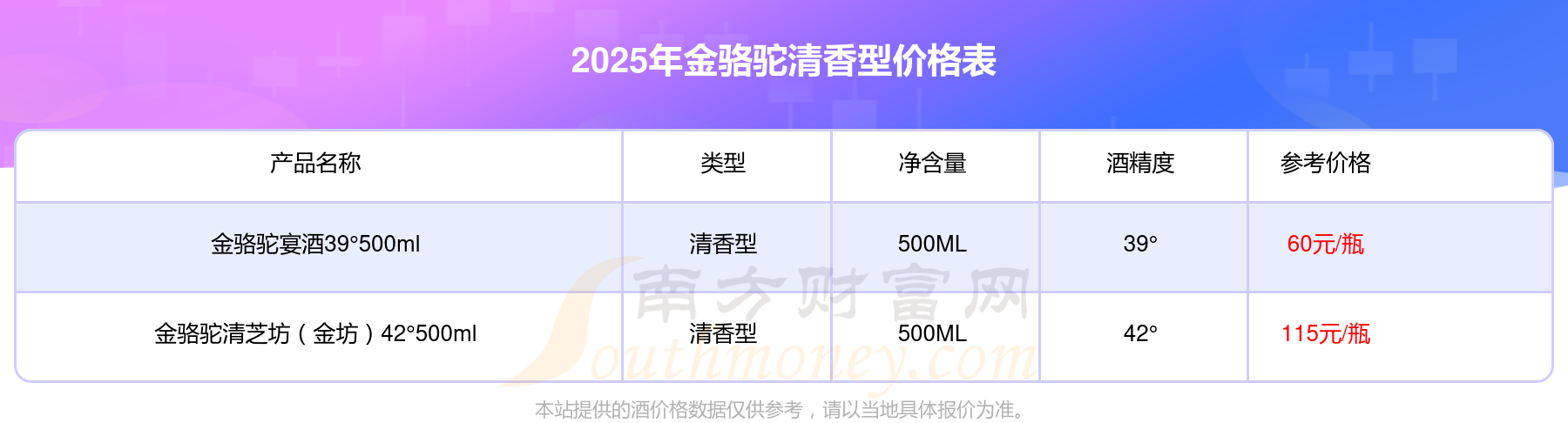 2025年,金駱駝清芝坊(金坊)42°500ml、金駱駝宴酒39°500ml等金駱駝清香型酒價格如下:金駱駝清芝坊(金坊)42°500ml參考價115元/瓶、金駱駝宴酒39°500ml參考價60元/瓶。