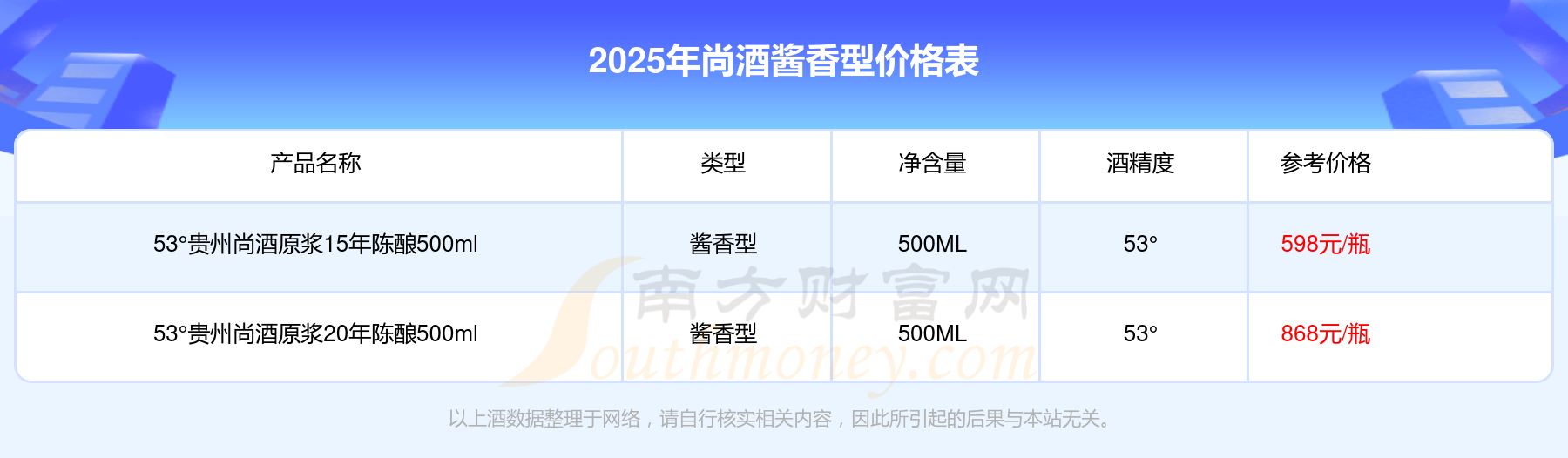 2025年,53°貴州尚酒原漿20年陳釀500ml、53°貴州尚酒原漿15年陳釀500ml等尚酒醬香型酒價(jià)格如下:
