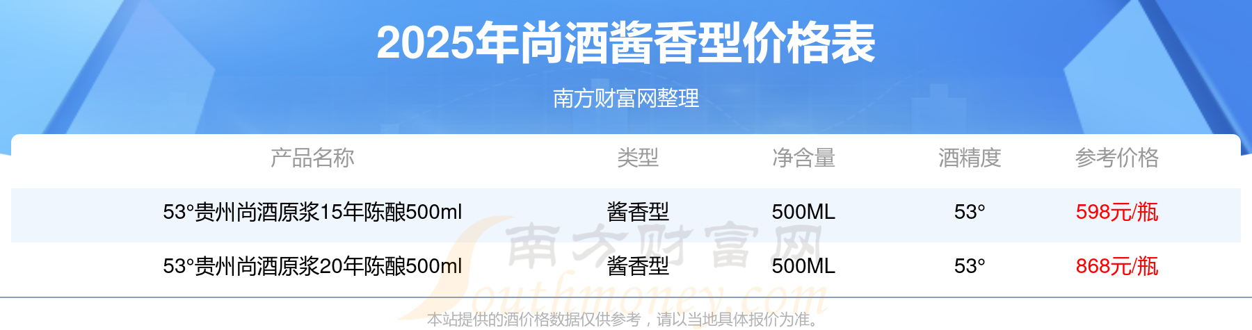 2025年,尚酒醬香型酒價格最高的是53°貴州尚酒原漿20年陳釀500ml,參考價868元,最低的是53°貴州尚酒原漿15年陳釀500ml,參考價598元,價格高低差為270元。