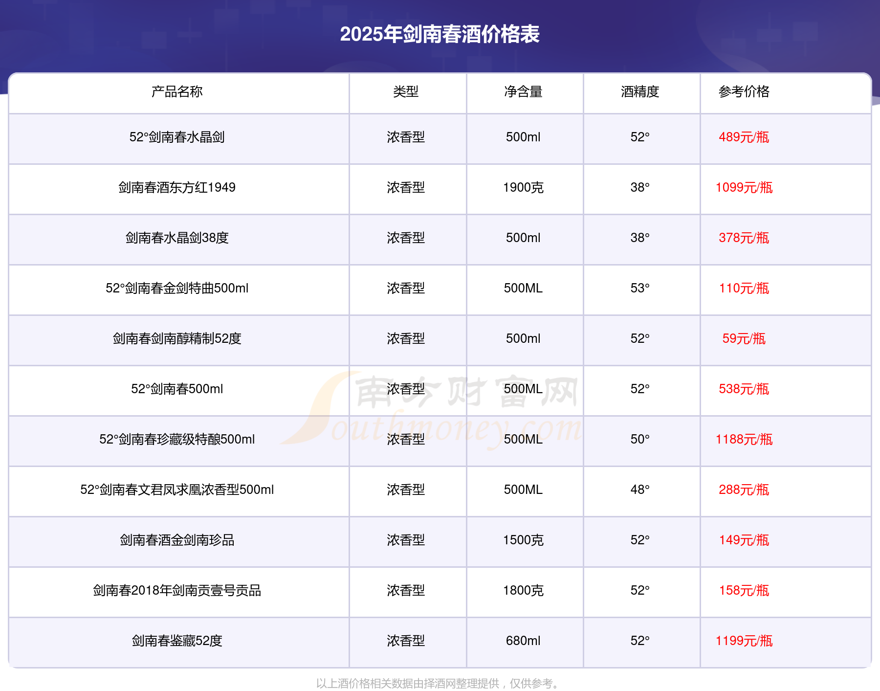 2025年,劍南春酒價(jià)格最高的是劍南春鑒藏52度,參考價(jià)1199元,最低的是劍南春劍南醇精制52度,參考價(jià)59元,價(jià)格高低差為1140元。
