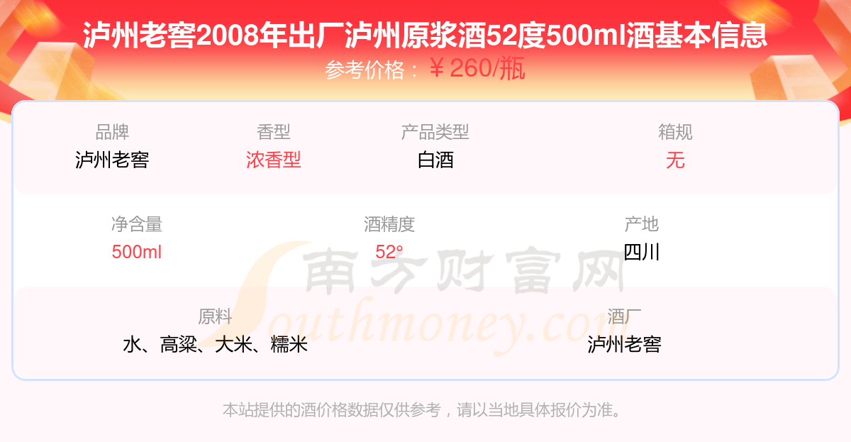 瀘州老窖2008年出廠瀘州原漿酒52度500ml基本信息