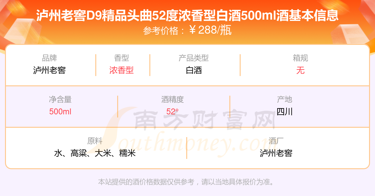 瀘州老窖D9精品頭曲52度濃香型白酒500ml基本信息