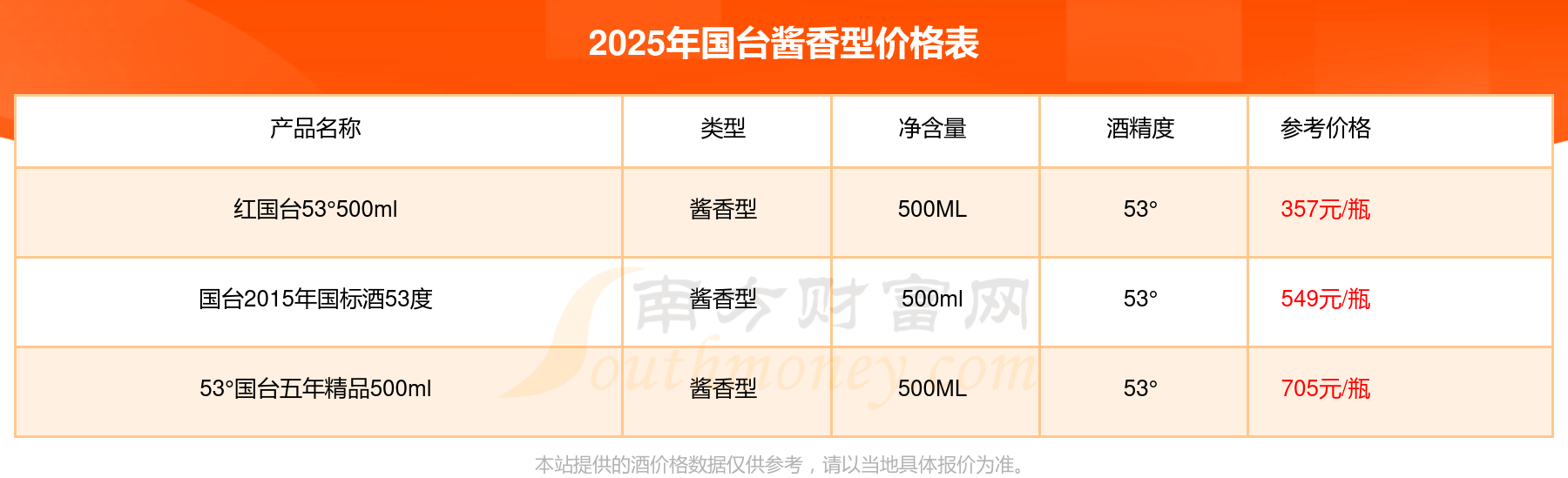 53°國臺五年精品500ml參考價705元/瓶、國臺2015年國標酒53度參考價549元/瓶、紅國臺53°500ml參考價357元/瓶。