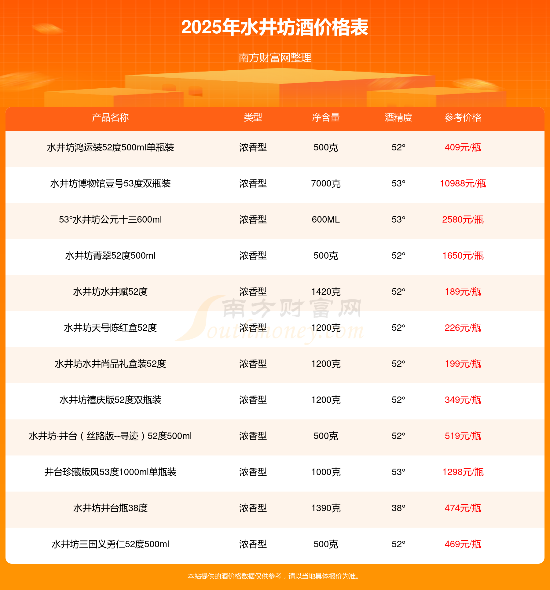 2025年水井坊酒水井坊大壇收藏級(jí)原漿天球瓶66度、水井坊博物館壹號(hào)53度雙瓶裝、53°水井坊公元十三600ml、水井坊梅蘭竹菊52度濃香型600ml4瓶、水井坊菁翠52度500ml、井臺(tái)珍藏版龍53度1000ml單瓶裝等最新價(jià)格如下: