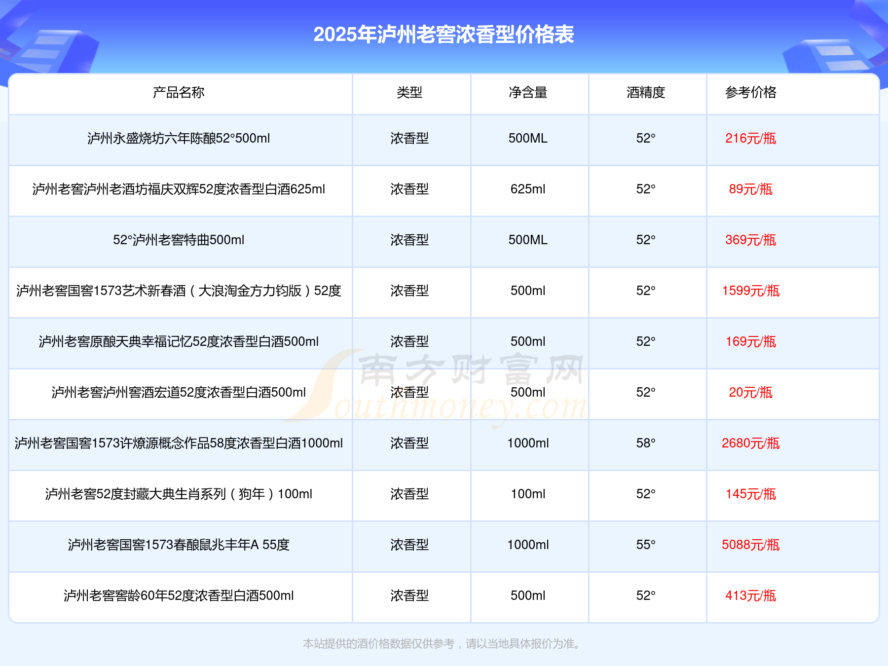 2025年,瀘州老窖國窖1573春釀鼠兆豐年E 55度、瀘州老窖國窖1573生命中的那壇酒55度014、瀘州老窖國窖1573春釀鼠兆豐年A 55度、瀘州老窖國窖1573生命中的那壇酒55度013濃香型白酒1000ml、瀘州老窖國窖1573生命中的那壇酒55度009 1000ml、瀘州老窖國窖1573中國品味52度濃香型白酒500ml、瀘州老窖國窖1573許燎源概念作品58度濃香型白酒1000ml等瀘州老窖濃香型酒參考價格如下:瀘州老窖國窖1573春釀鼠兆豐年E 55度參考價17999元、瀘州老窖國窖1573生命中的那壇酒55度014參考價9999元、瀘州老窖國窖1573春釀鼠兆豐年A 55度參考價5088元、瀘州老窖國窖1573生命中的那壇酒55度013濃香型白酒1000ml參考價4988元、瀘州老窖國窖1573生命中的那壇酒55度009 1000ml參考價4288元、瀘州老窖國窖1573中國品味52度濃香型白酒500ml參考價2888元、瀘州老窖國窖1573許燎源概念作品58度濃香型白酒1000ml參考價2680元。