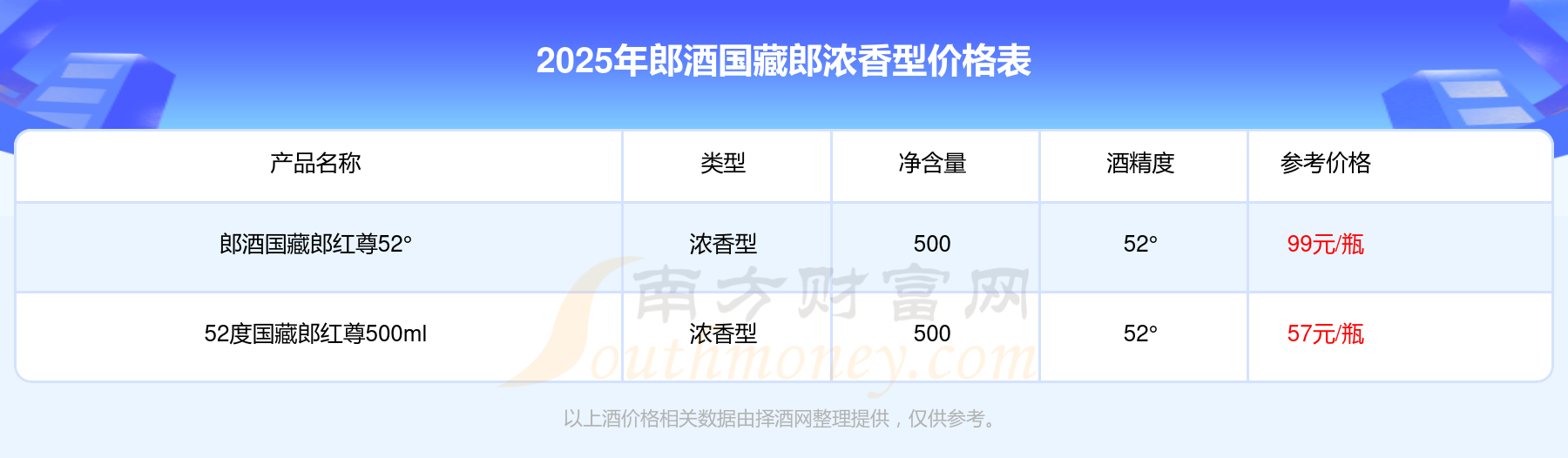 郎酒國(guó)藏郎濃香型酒最新價(jià)格2025:郎酒國(guó)藏郎紅尊52°參考價(jià)99元/瓶、52度國(guó)藏郎紅尊500ml參考價(jià)57元/瓶。