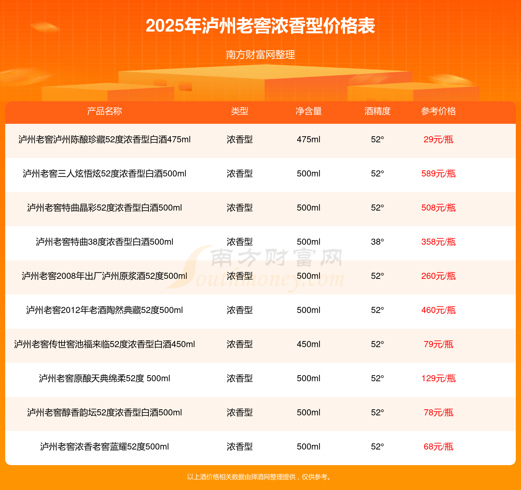 瀘州老窖濃香型酒價格最高的是瀘州老窖國窖1573春釀鼠兆豐年E 55度,參考價17999元/瓶,最低的是瀘州老窖45度五洲醉8窖經(jīng)典小酒版濃香型100ml,參考價10元/瓶,價格高低差為17989元/瓶。