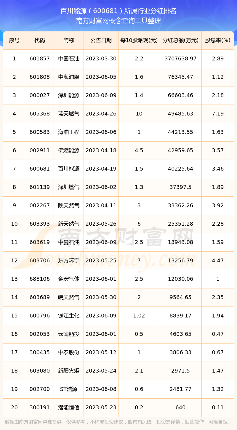 二、百川能源600681行業(yè)分紅排名