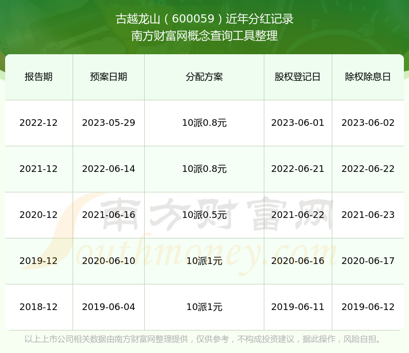 古越龍山最新一次公布的分紅方案為10派0.8元。本次權(quán)益分派股權(quán)登記日為2023年6月1日,除權(quán)除息日為2023年6月2日,派息日為2023年6月2日。