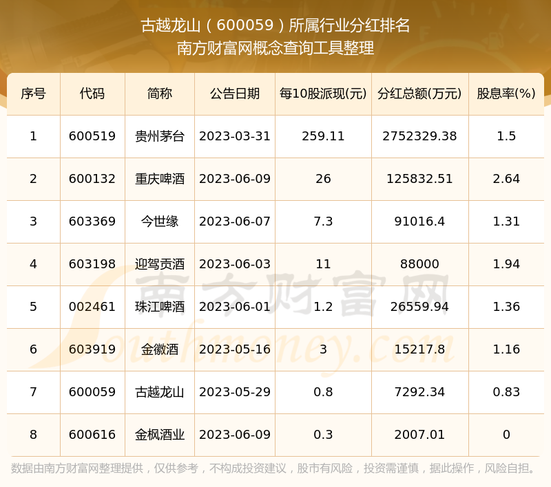 按照南方財(cái)富網(wǎng)趨勢(shì)選股系統(tǒng)統(tǒng)計(jì),古越龍山所屬行業(yè)為釀酒行業(yè)行業(yè),釀酒行業(yè)行業(yè)分紅排名情況如下表: