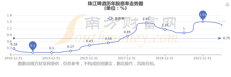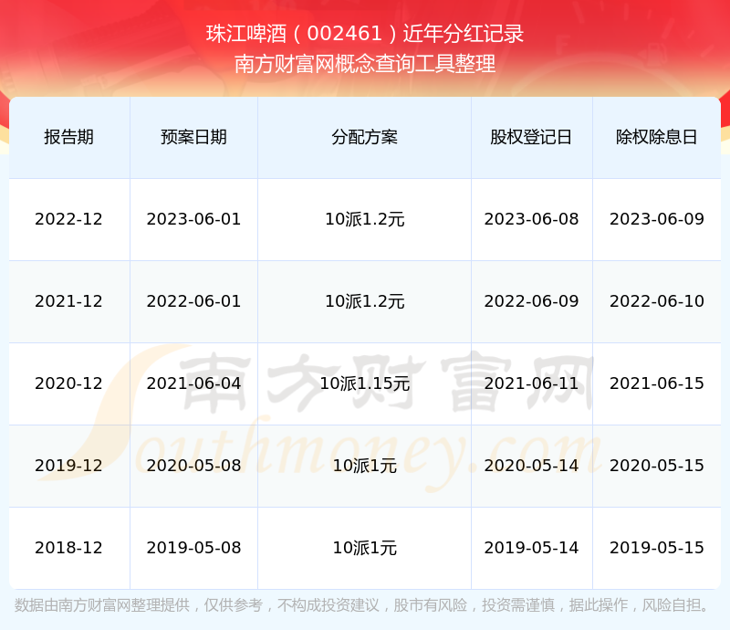 珠江啤酒最新一次公布的分紅方案為10派1.2元。本次權(quán)益分派股權(quán)登記日為2023年6月8日,除權(quán)除息日為2023年6月9日,派息日為2023年6月9日。