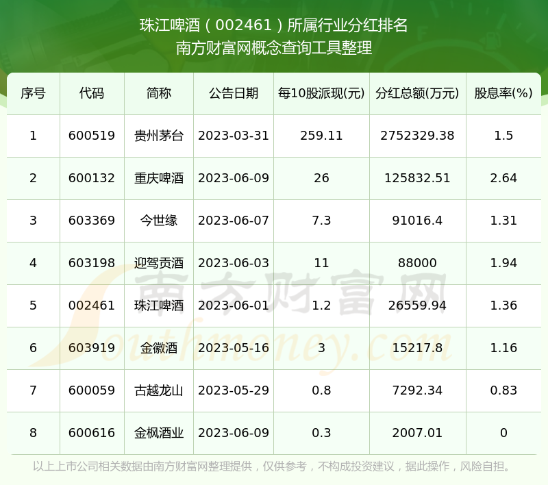 按照南方財富網(wǎng)趨勢選股系統(tǒng)統(tǒng)計,珠江啤酒所屬行業(yè)為啤酒行業(yè),啤酒行業(yè)分紅排名情況如下表: