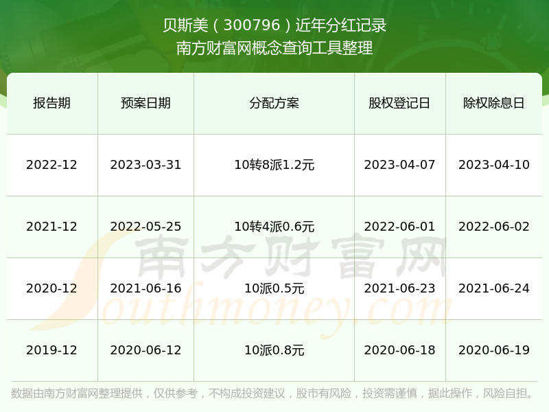 貝斯美最新一次公布的分紅方案為10轉(zhuǎn)8派1.2元。本次權(quán)益分派股權(quán)登記日為2023年4月7日,除權(quán)除息日為2023年4月10日,派息日為2023年4月10日。