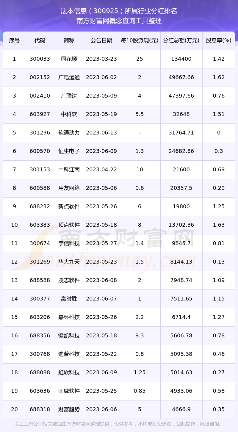 按照南方財富網(wǎng)趨勢選股系統(tǒng)統(tǒng)計,法本信息所屬行業(yè)為軟件開發(fā)行業(yè),軟件開發(fā)行業(yè)分紅排名情況如下表: