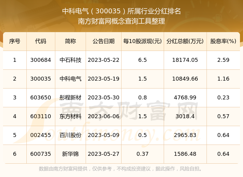 按照南方財富網(wǎng)趨勢選股系統(tǒng)統(tǒng)計,中科電氣所屬行業(yè)為鋰電材料行業(yè),鋰電材料行業(yè)分紅排名情況如下表: