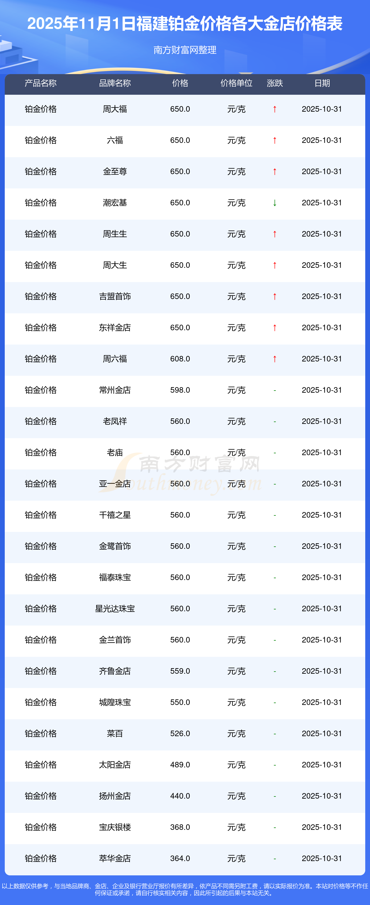 今天是2025年11月1日,福建周大福、周大福、周大福、周大福、周大福、周大福、周大福、老鳳祥、老鳳祥、老鳳祥、周六福等各大金店品牌鉑金價(jià)格最新價(jià)格如下:周大福1198.0元/克、周大福650.0元/克、周大福1198.0元/克、周大福44660.0、周大福18640.0、周大福40080.0、周大福1058.0元/克、老鳳祥1200.0元/克、老鳳祥560.0元/克、老鳳祥1200.0元/克、周六福1135.0元/克。