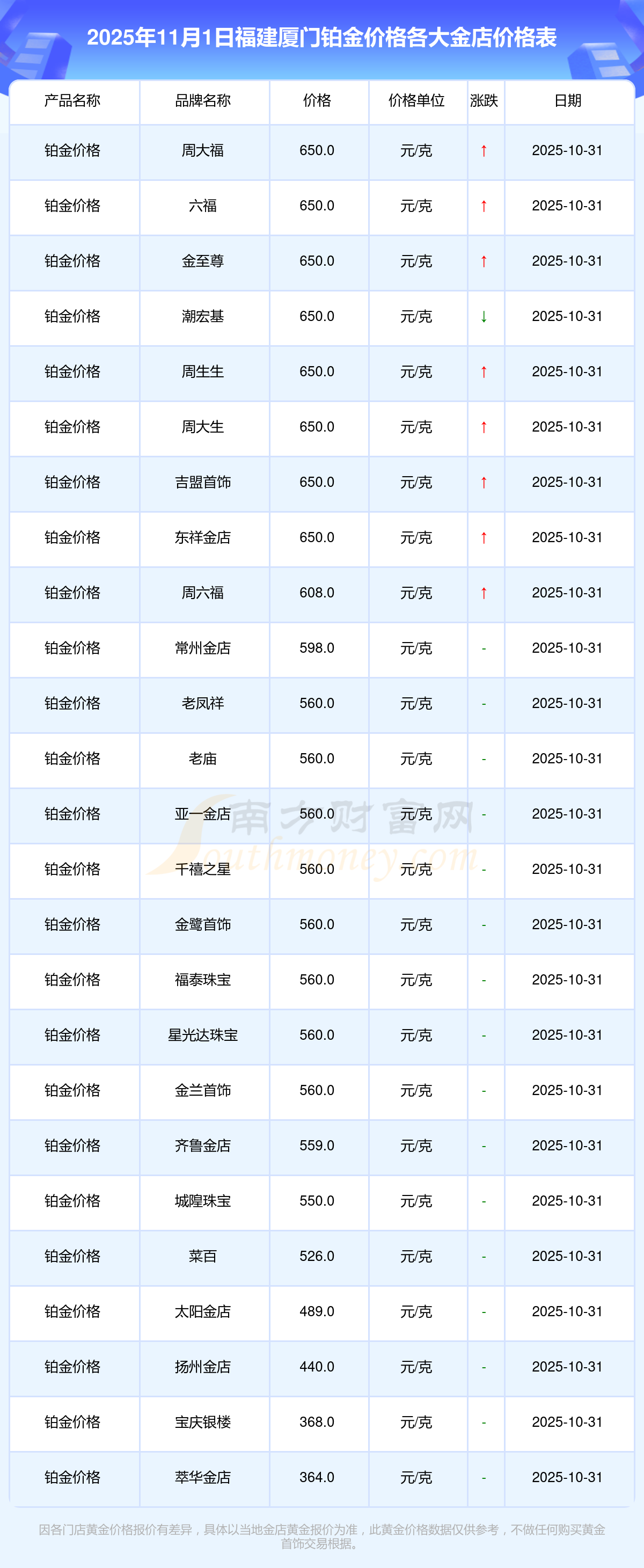 2025年11月1日,福建廈門周大福、周大福、周大福、周大福、周大福、周大福、周大福、老鳳祥、老鳳祥、老鳳祥、周六福等各大金店品牌鉑金價格今日價格行情最新來了:周大福1198.0元/克、周大福650.0元/克、周大福1198.0元/克、周大福44660.0、周大福18640.0、周大福40080.0、周大福1058.0元/克、老鳳祥1200.0元/克、老鳳祥560.0元/克、老鳳祥1200.0元/克、周六福1135.0元/克。