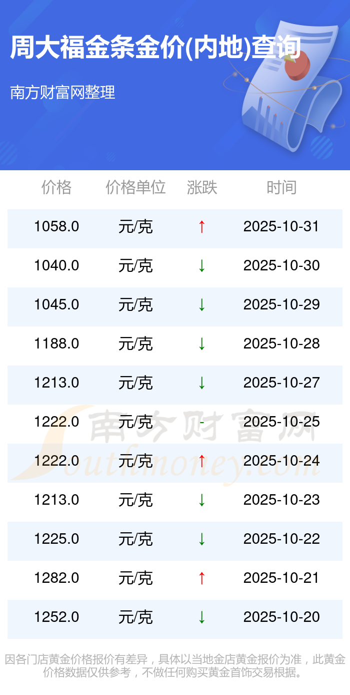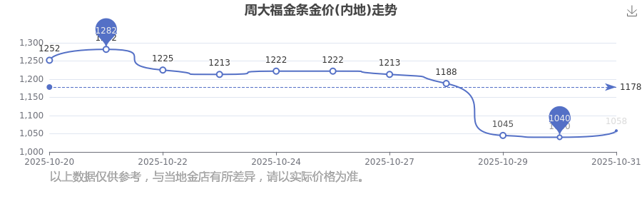 今日周大福 金條金價(jià)(內(nèi)地)最新的克重售價(jià)為1058.0元/克。