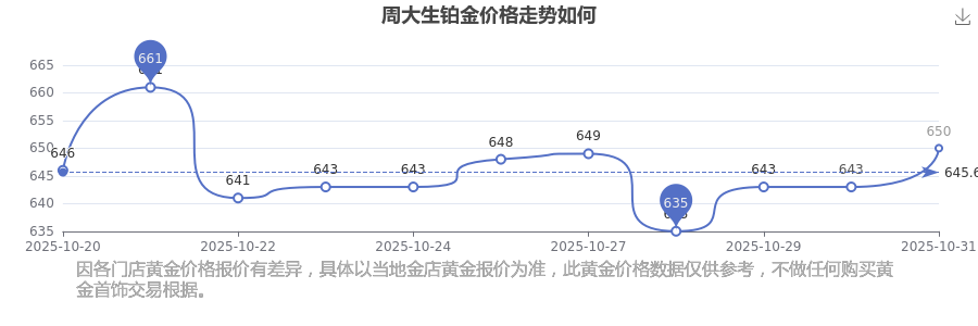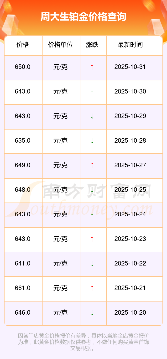 周大生今日 鉑金價格的最新市場行情價為650.0元/克。