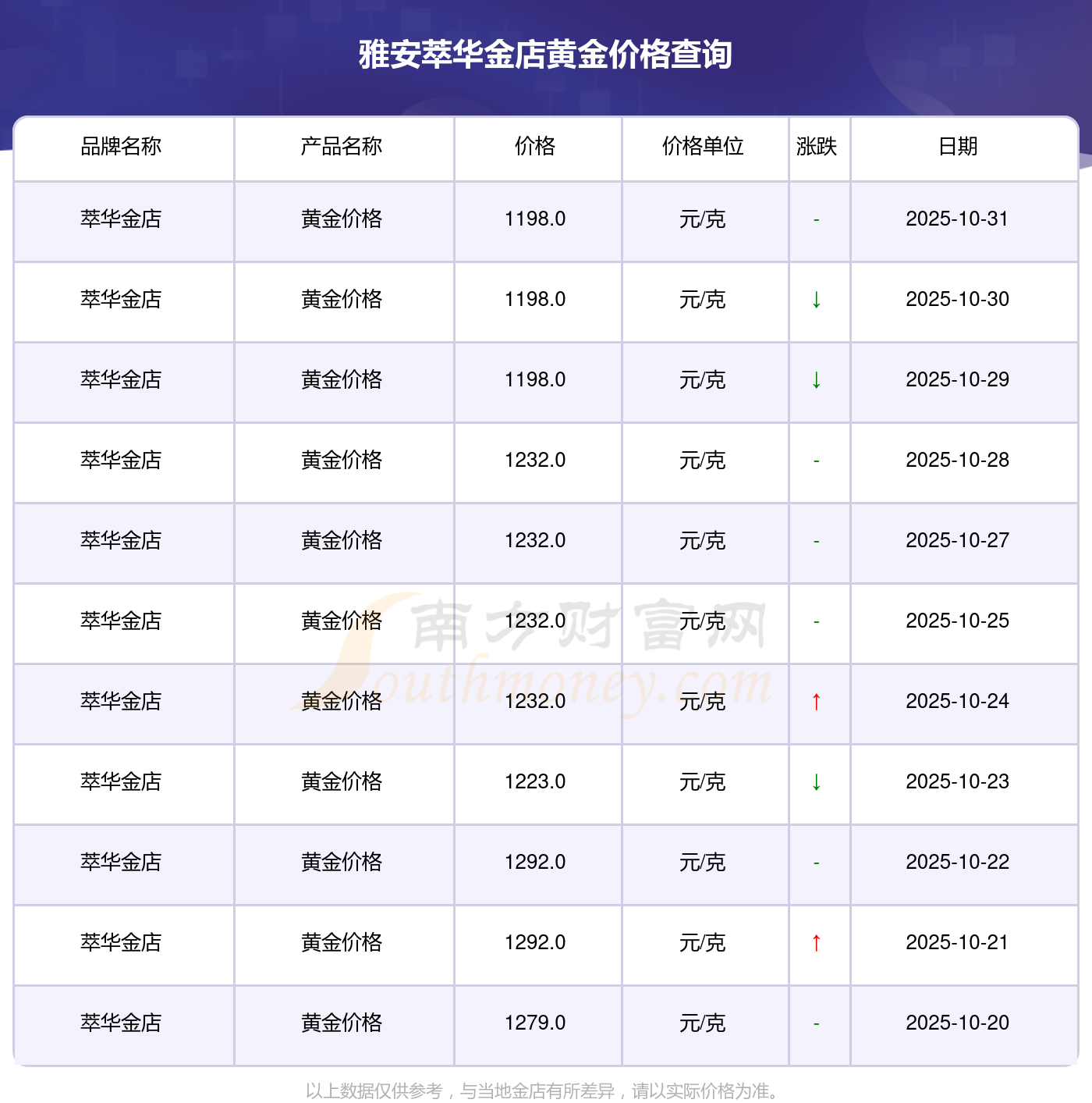 今日(2025年11月1日),雅安萃華金店黃金價(jià)格的價(jià)格是1198.0元/克。