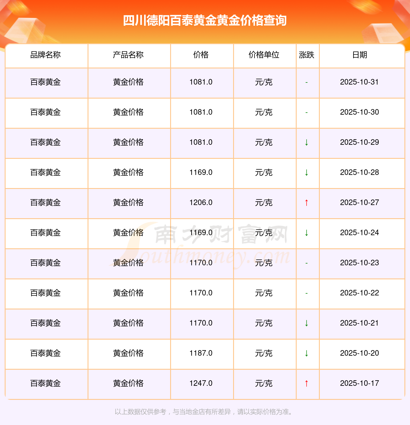 四川德陽百泰黃金在 2025年11月1日的黃金價(jià)格零售價(jià)格為 1081.0元/克。