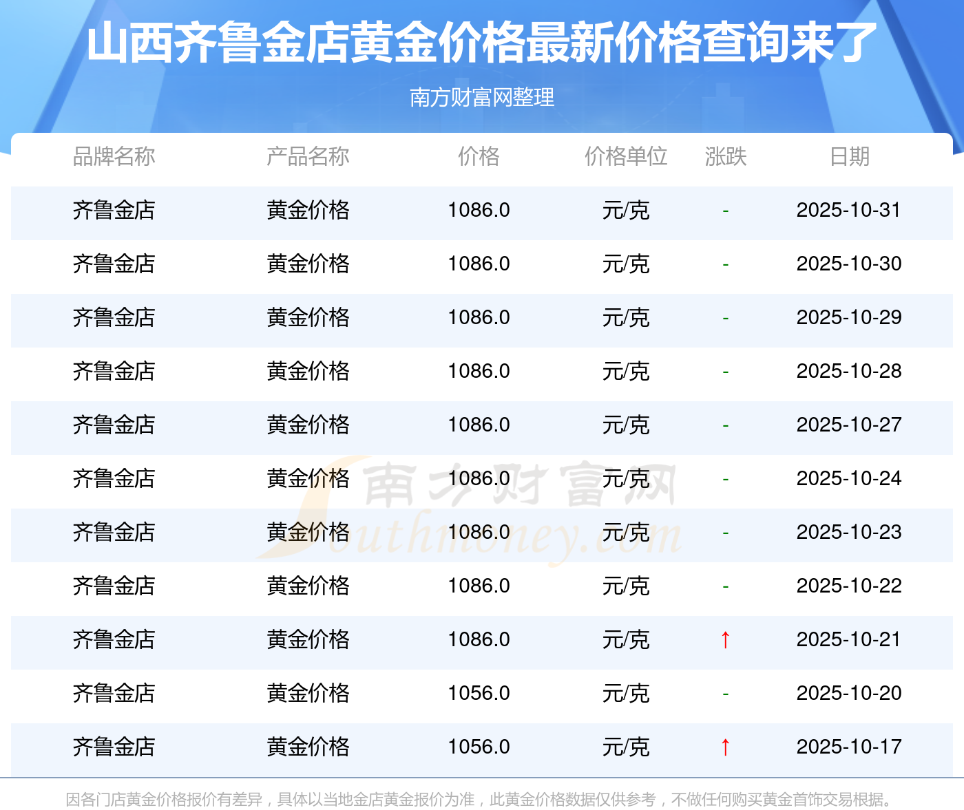 山西齊魯金店現(xiàn)在黃金價格每克多少?今日一克黃金的價格行情如何?今日山西齊魯金店黃金價格查詢,今日2025年11月1日,山西齊魯金店黃金價格為1086.0元/克。
