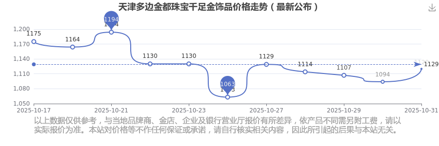 2025年11月1日天津多邊金都珠寶千足金飾品價格是1120.0元/克。