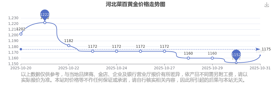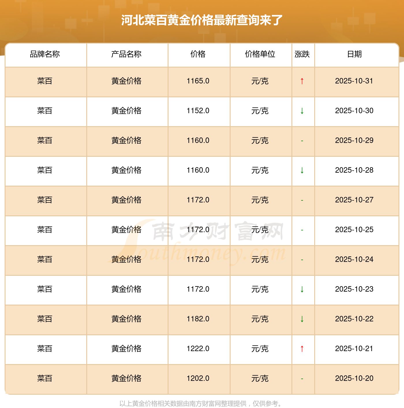 今日(2025年11月1日)河北菜百黃金價格為1165.0元/克。